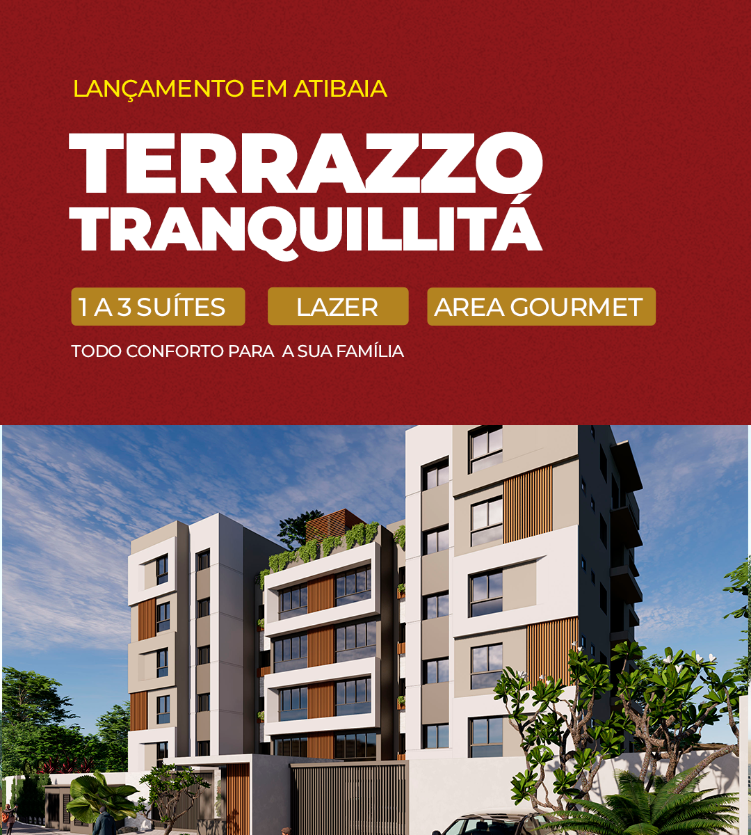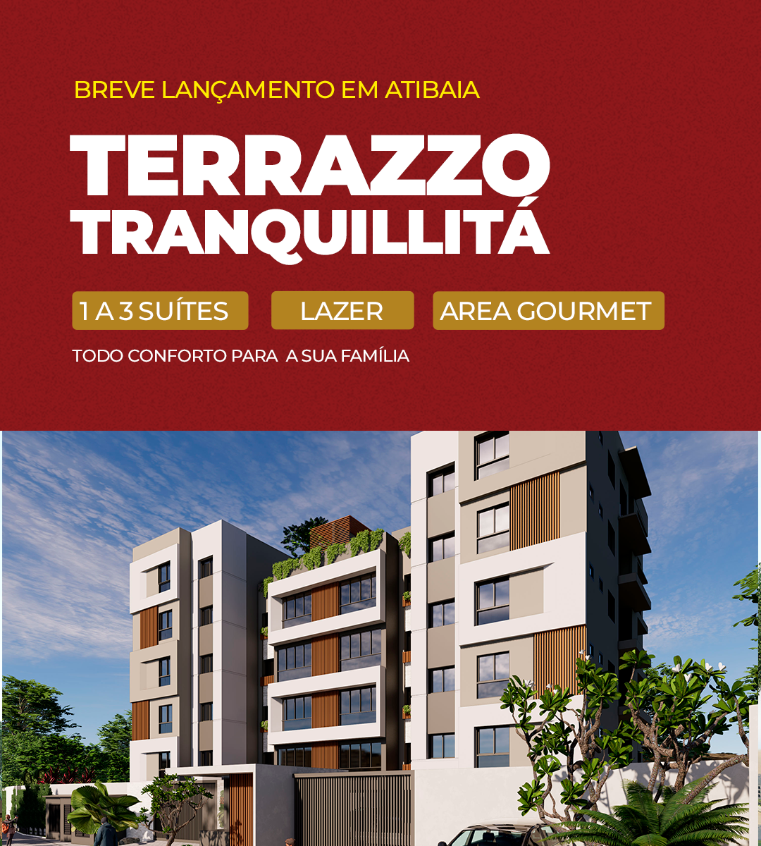 CONHEÇA O TERRAZZOTRANQUILLITÁ Composto por apartamentos de 1, 2 ou 3 suítes, com lavabo, área gourmet e churrasqueira a carvão, em um condomínio com lazer completo e contato com a natureza, próximo à Alameda Lucas Nogueira Garcez. Fale conosco MAIS QUE UM CONDOMÍNIO, UM ESTILO DE VIDA! Fale conosco IMPLANTAÇÃO DO CONDOMÍNIO Fale conosco